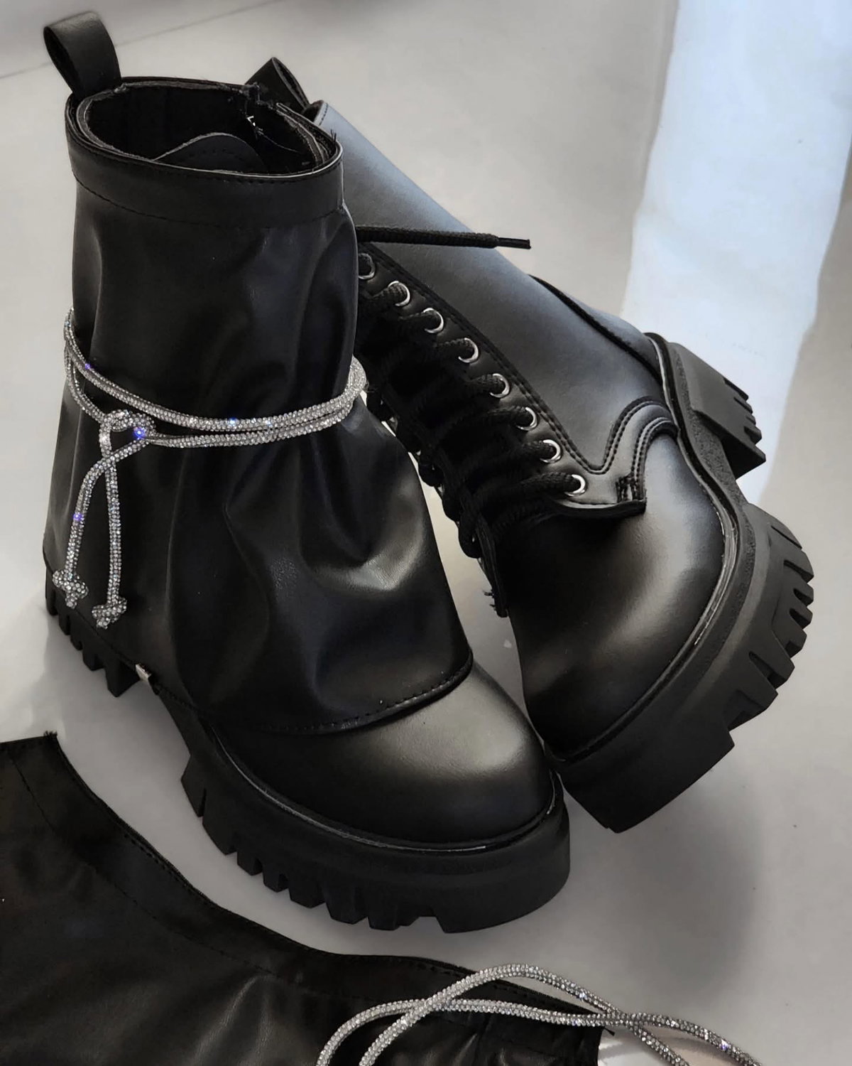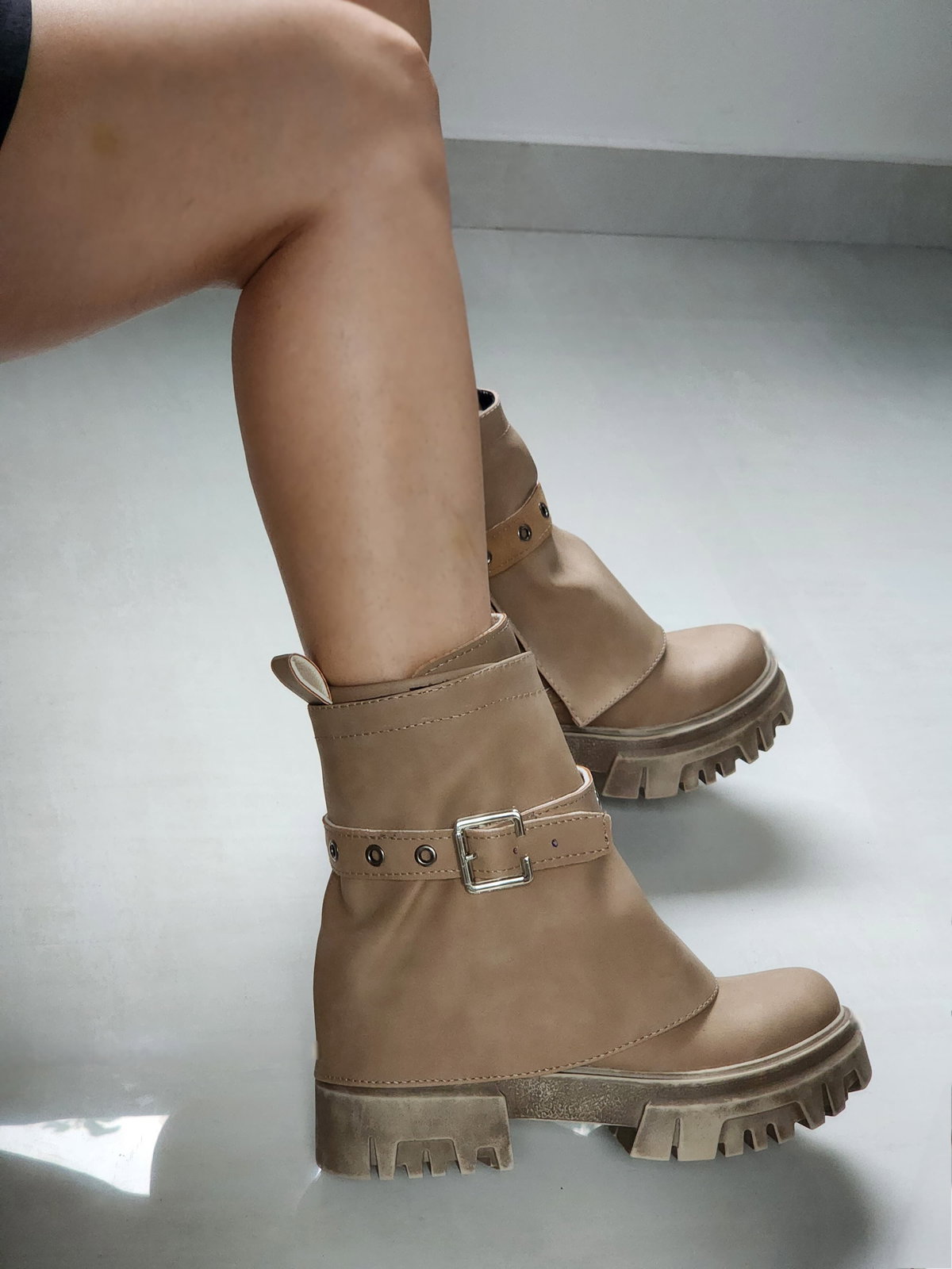 Con aplique de cinturon a tono, desmontable y suela chunky que aporta personalidad y comodidad. Pollera también desmontable.